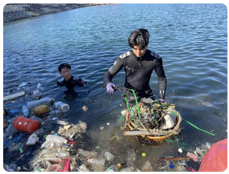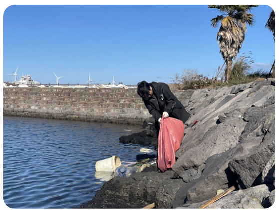 Last Saturday, our Spiritus team spent the entire day at a diving resort in Jeju for an ocean cleanup activity. We had always known that marine pollution was a serious issue, but seeing it in person was completely different from reading about it or watching videos. With four people on our team, we divided ourselves into pairs so we could work more efficiently. Two of us went into the cold water to collect trash along the rocky underwater walls, while the other two stayed on land to receive the collected waste and organize it into large sacks.